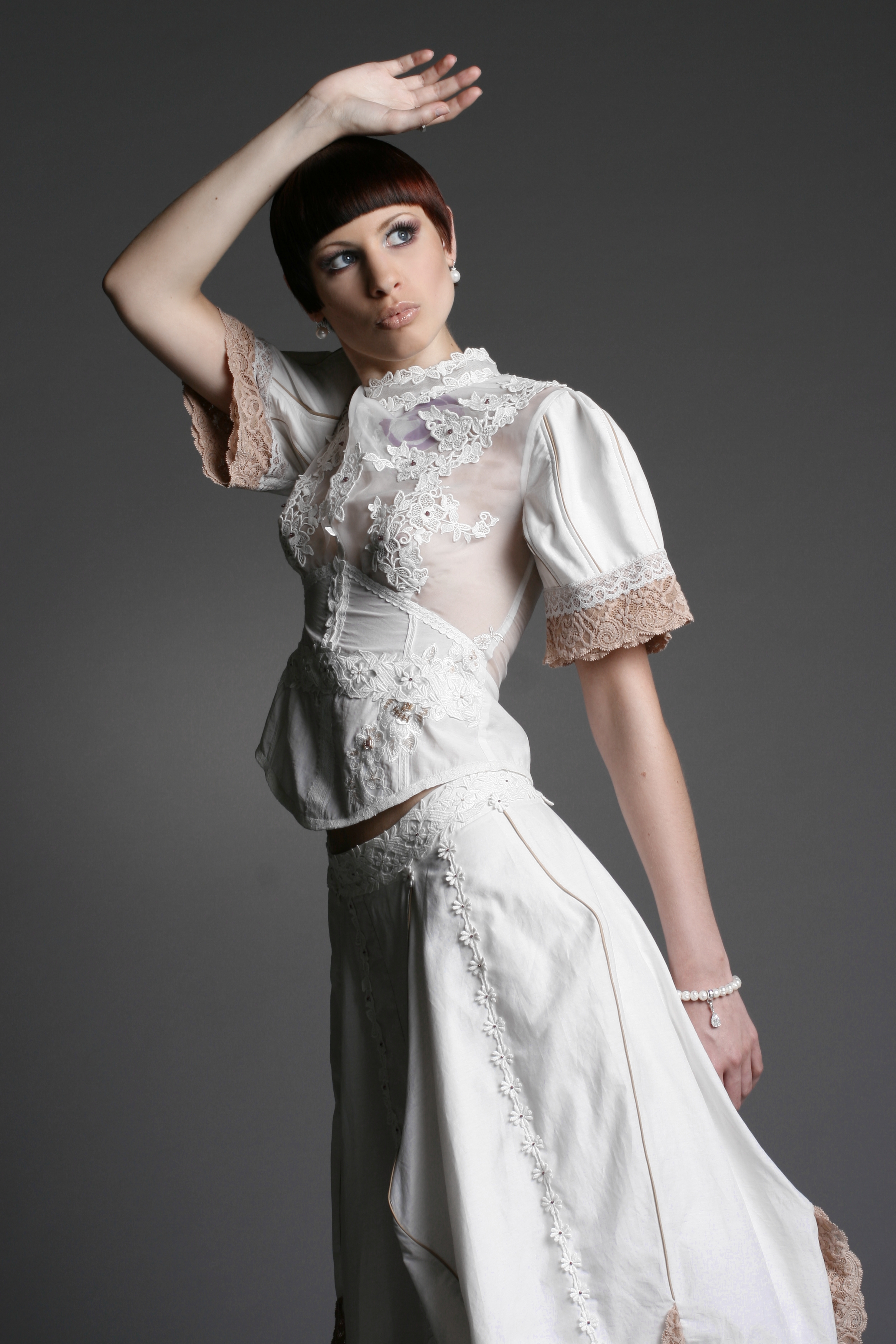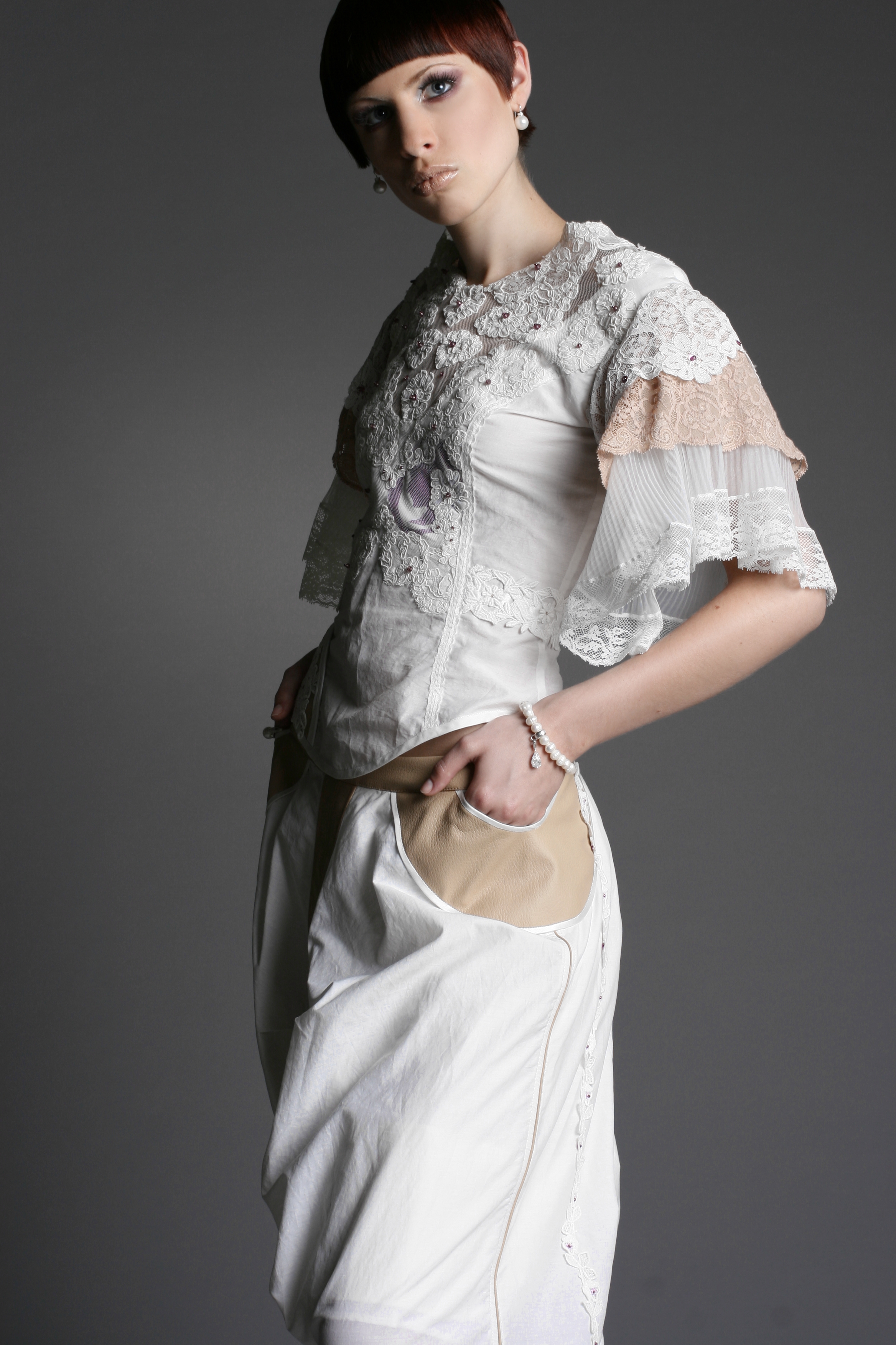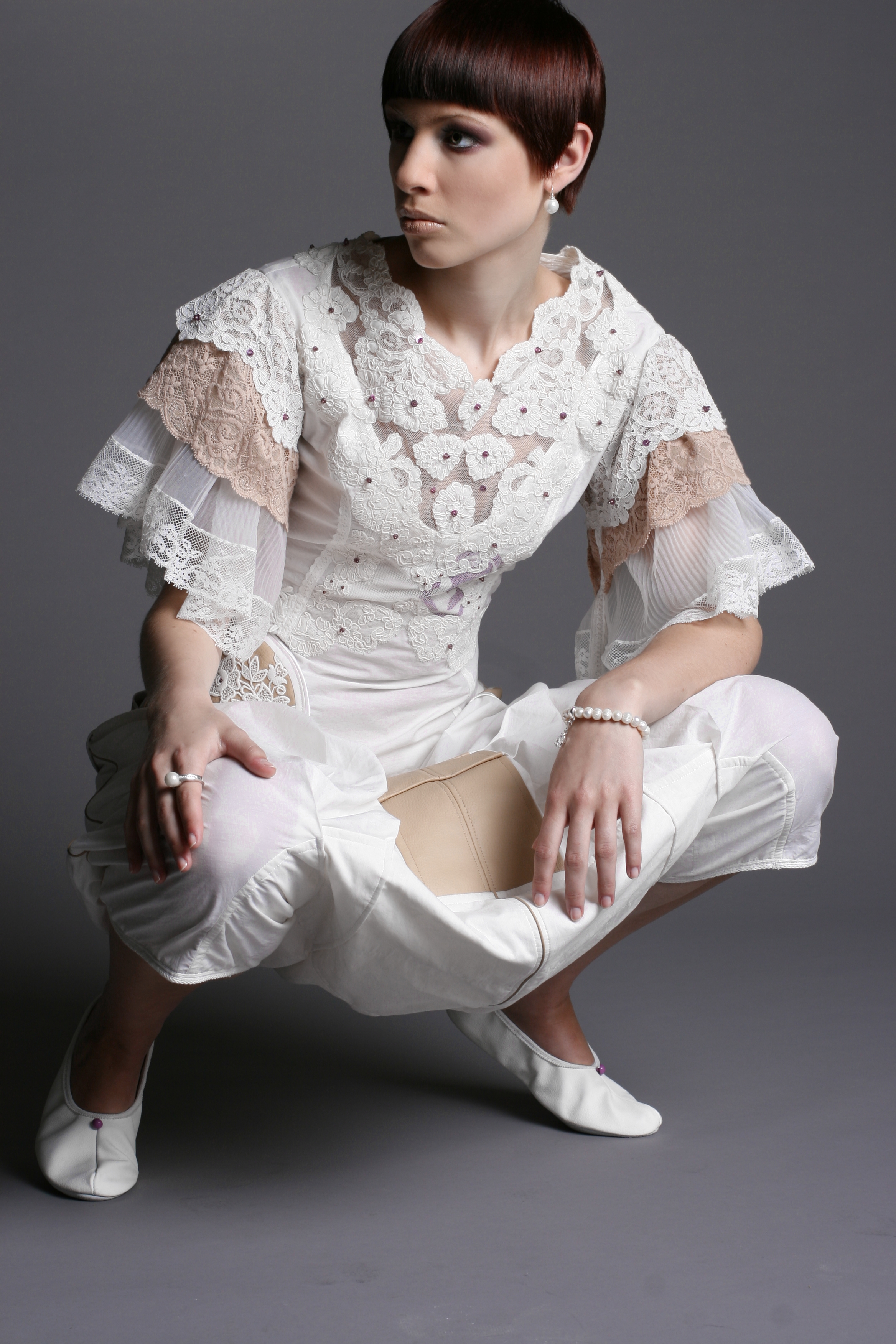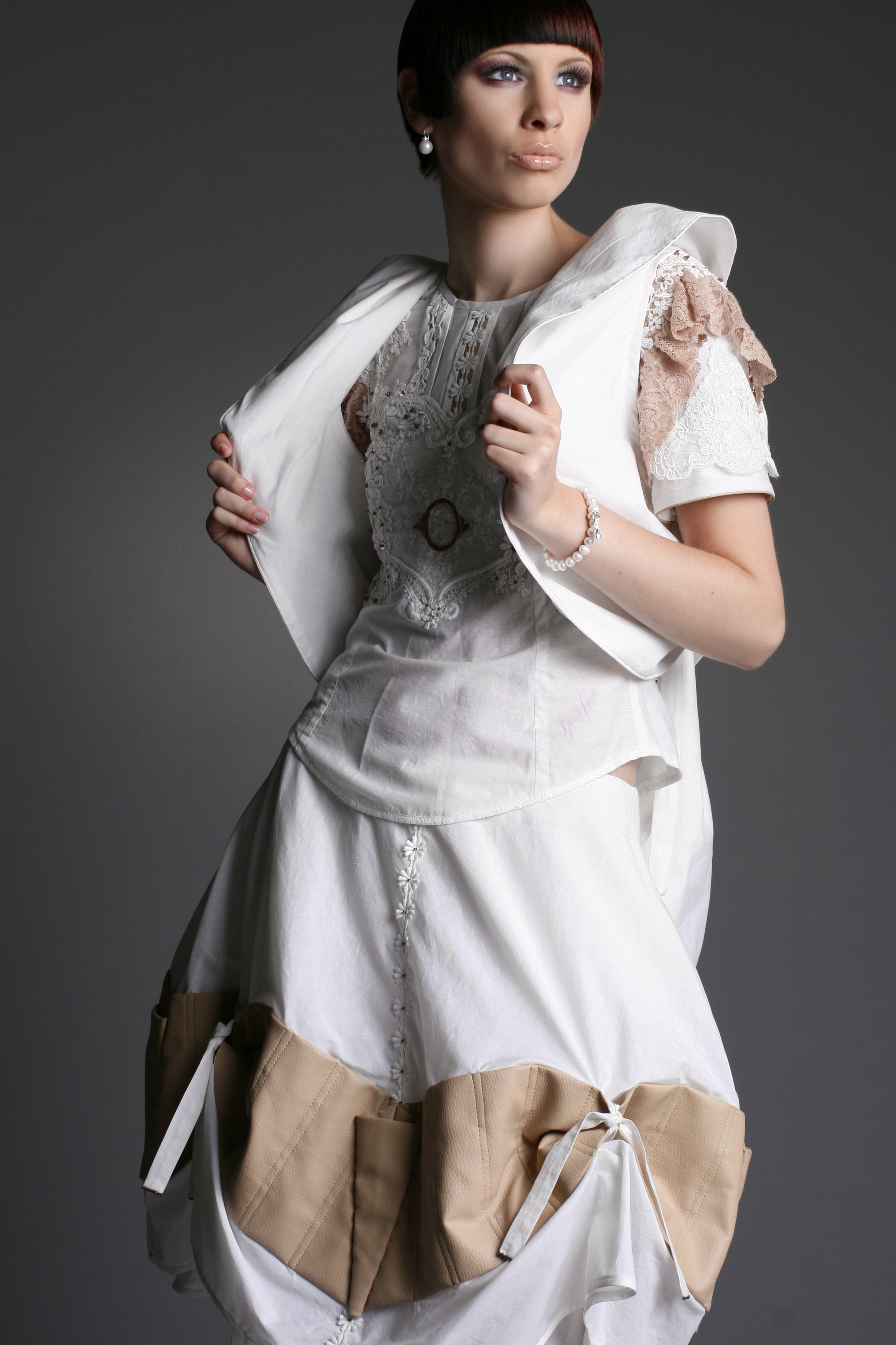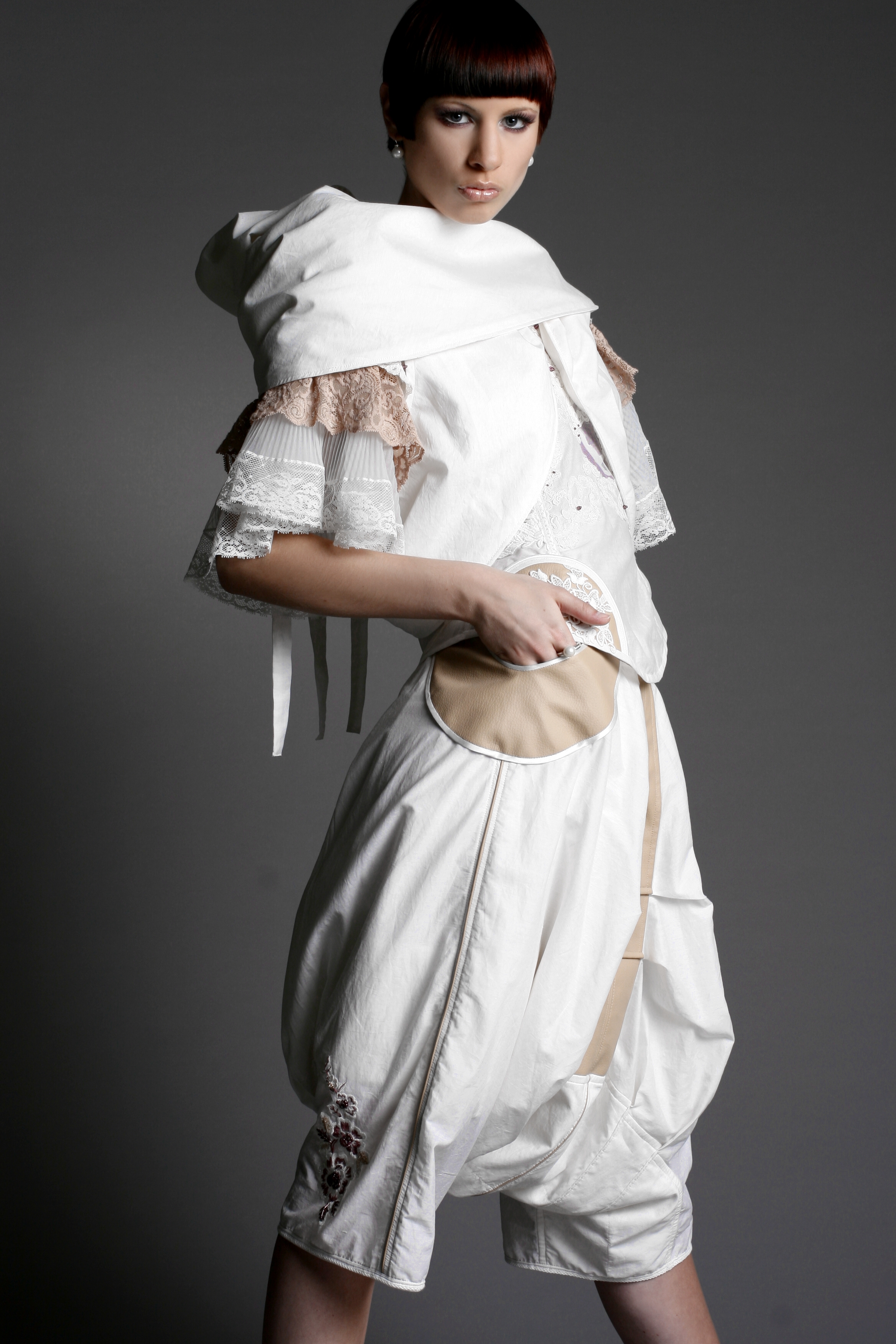 Das Weibliche wird durch die Schnittführung, unzählige Handstickereien, Applikationen und die Zierde aus der Strumpfhosenspitze unterstützt.