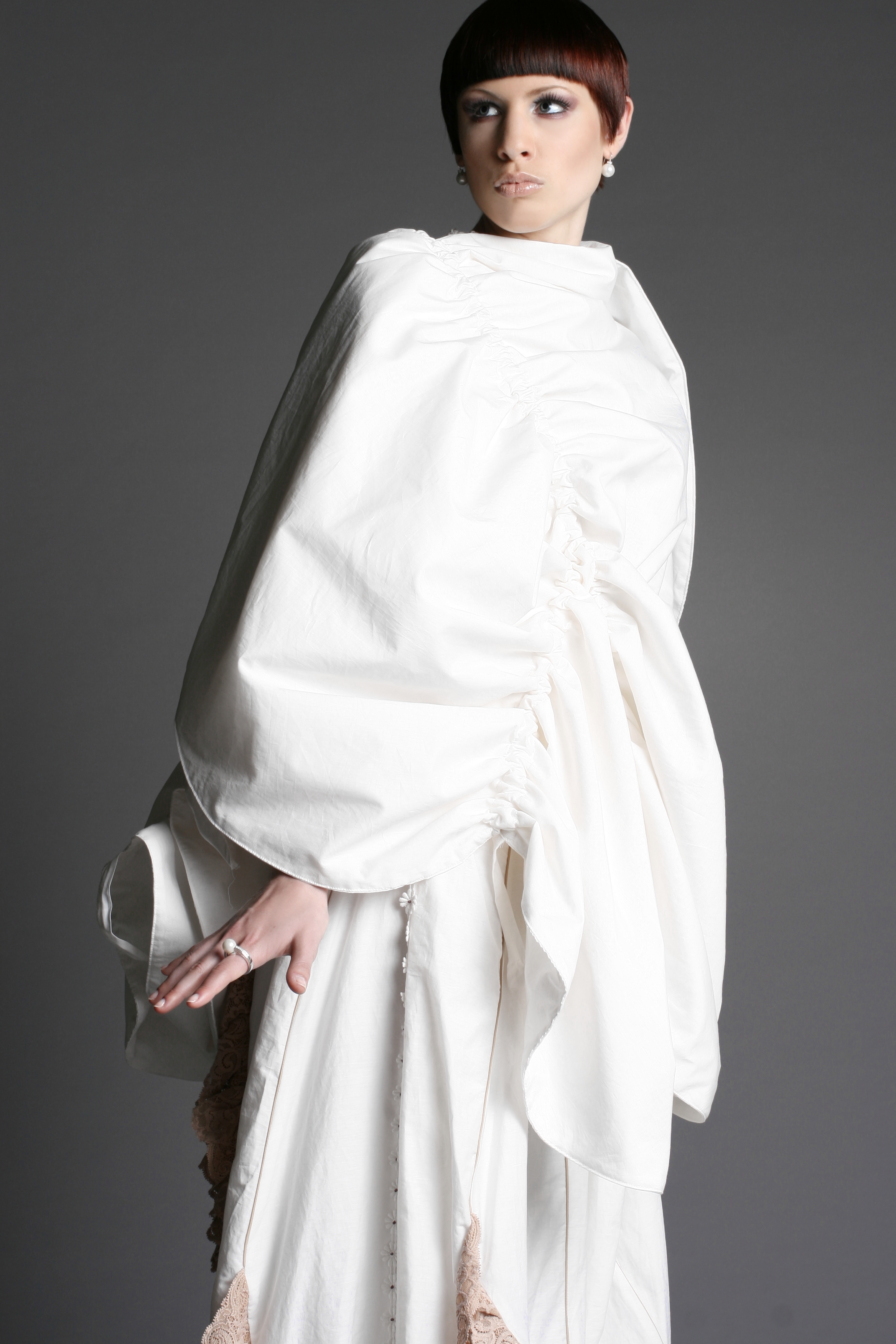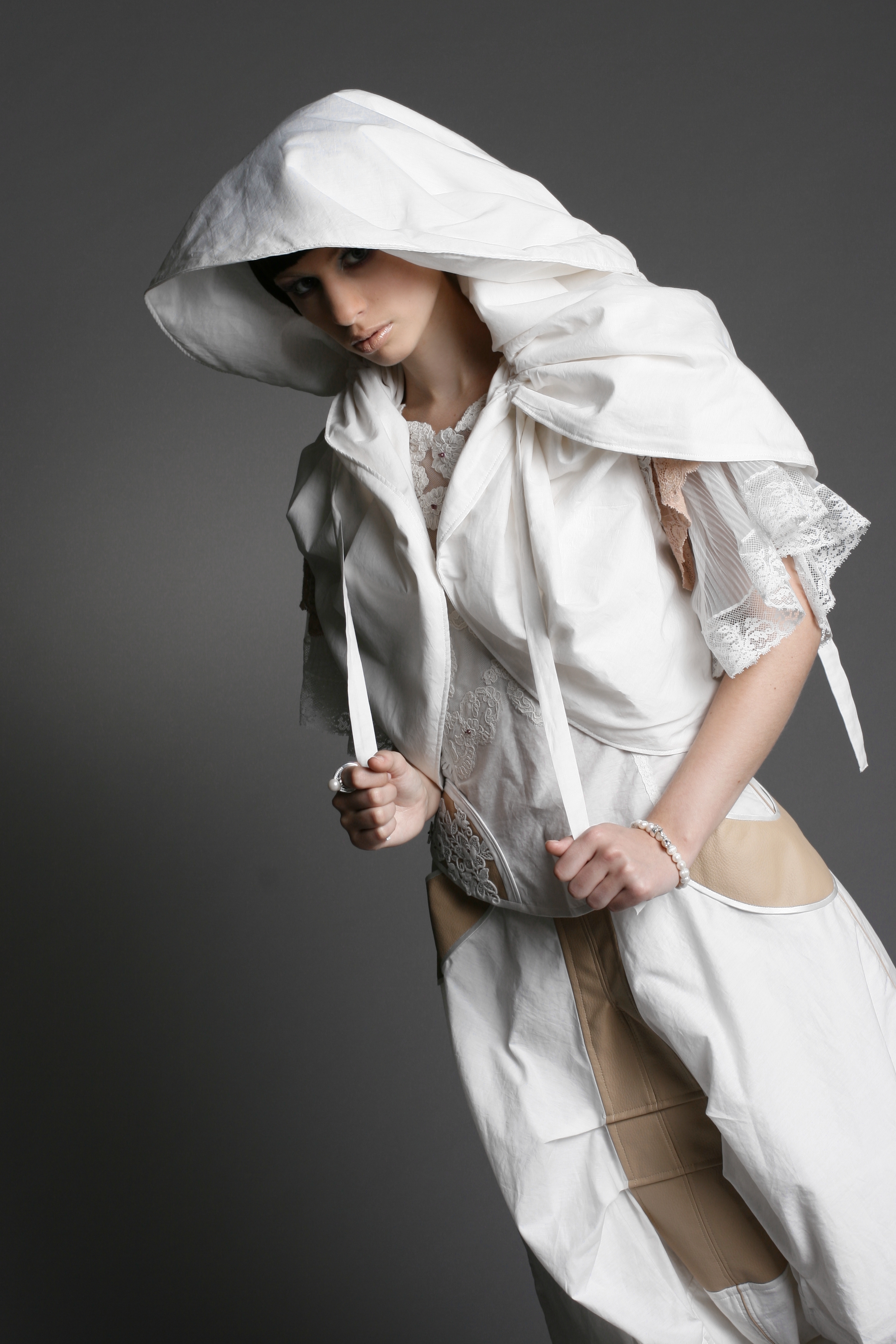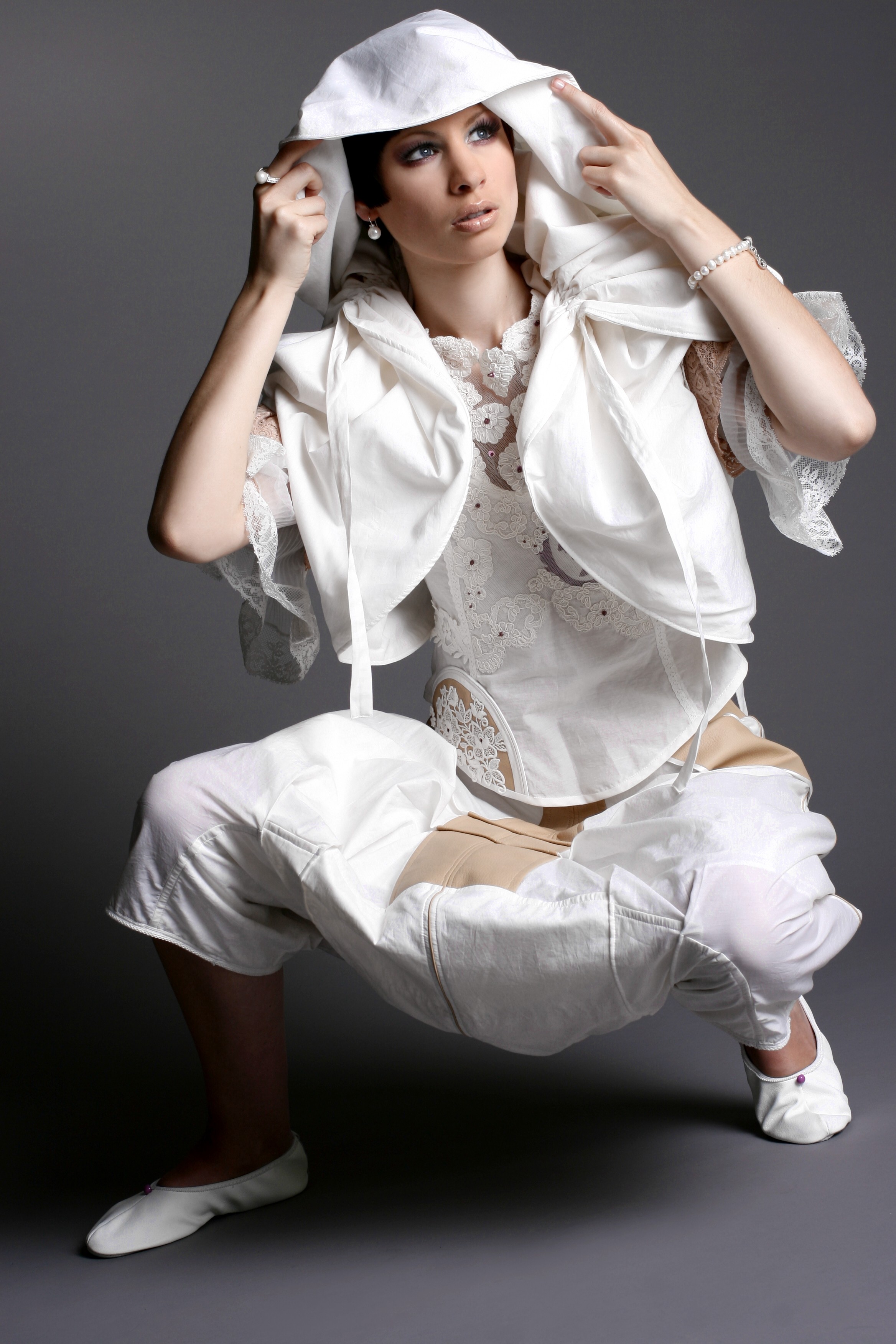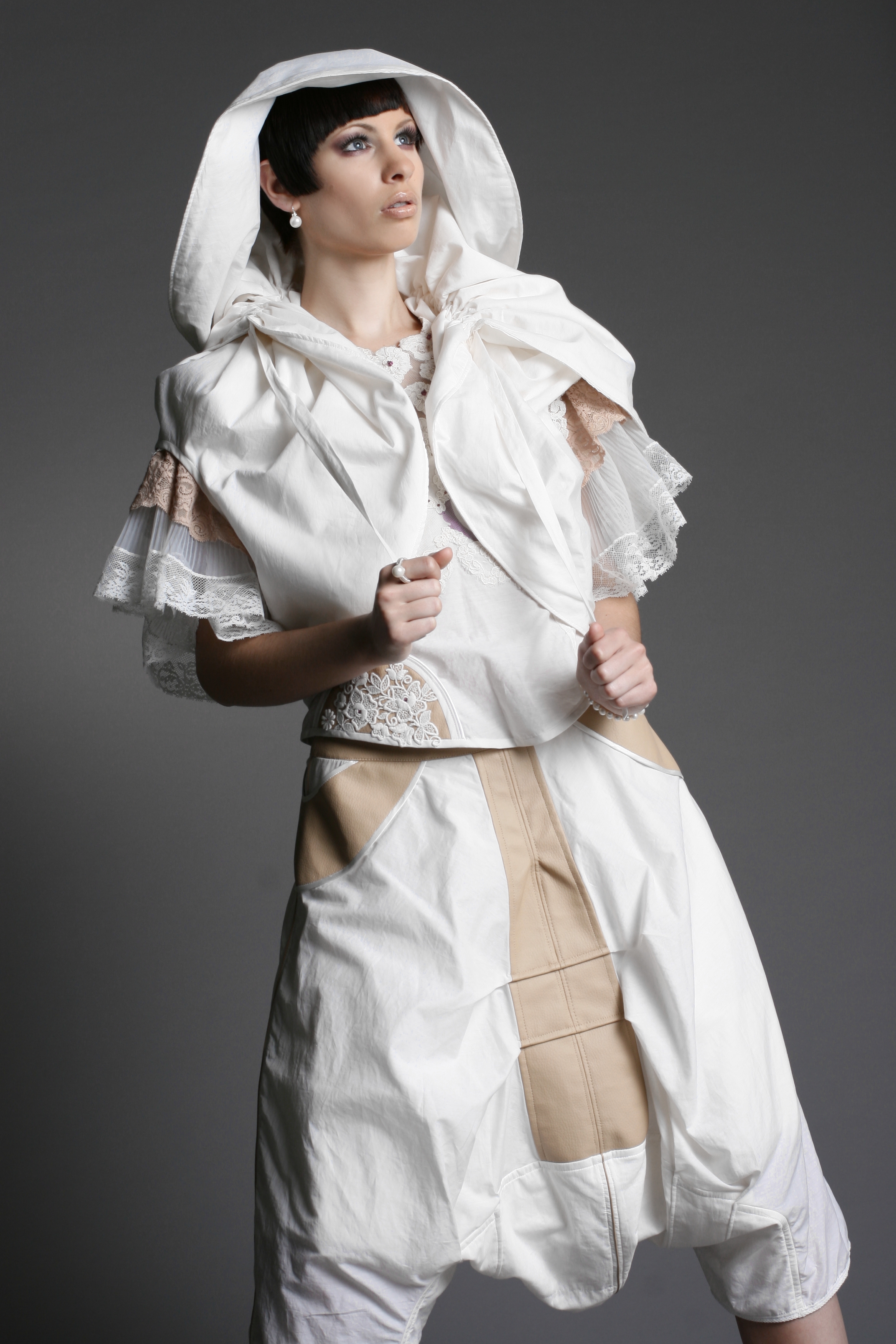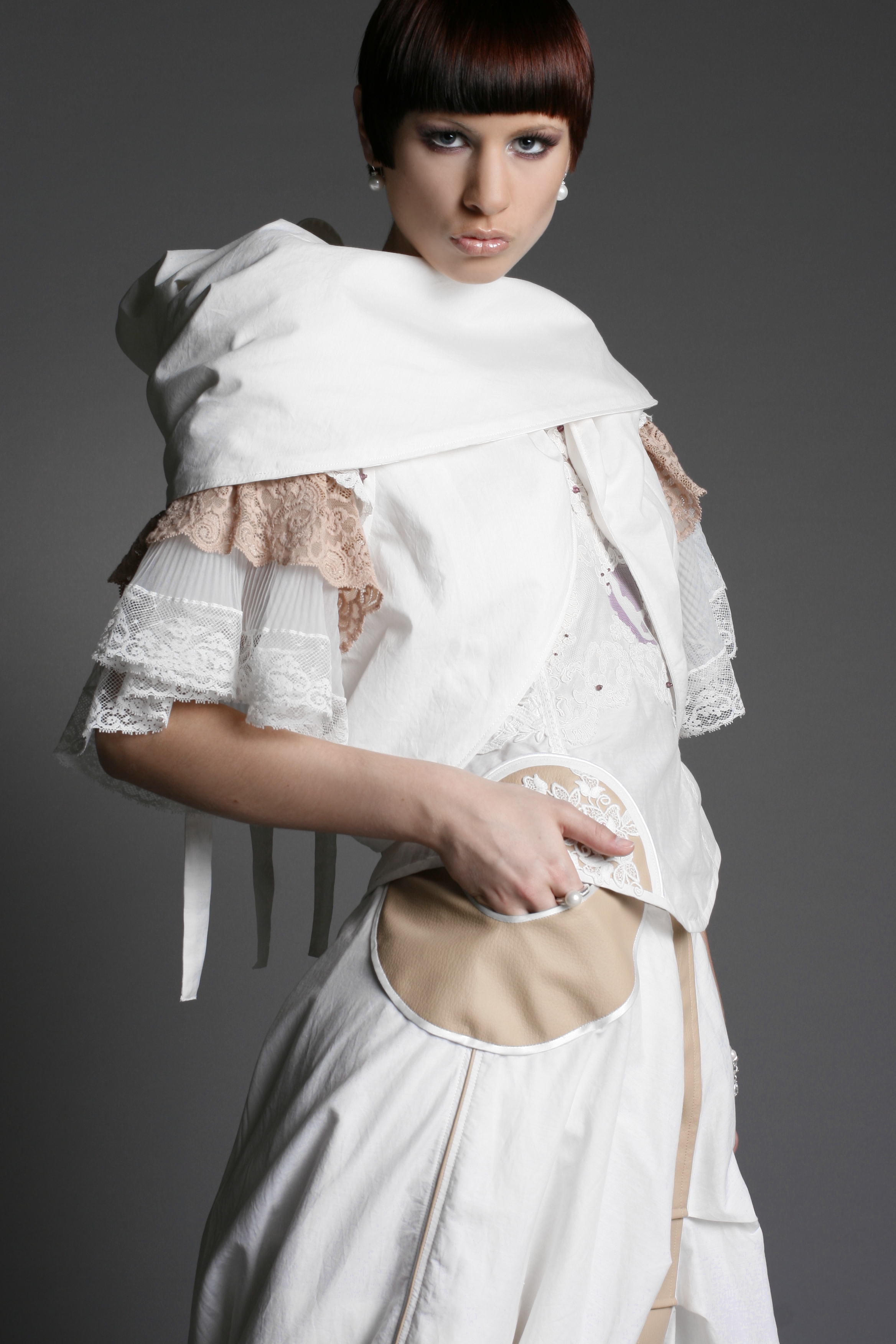 Das Weibliche wird durch die Schnittführung, unzählige Handstickereien, Applikationen und die Zierde aus der Strumpfhosenspitze unterstützt.