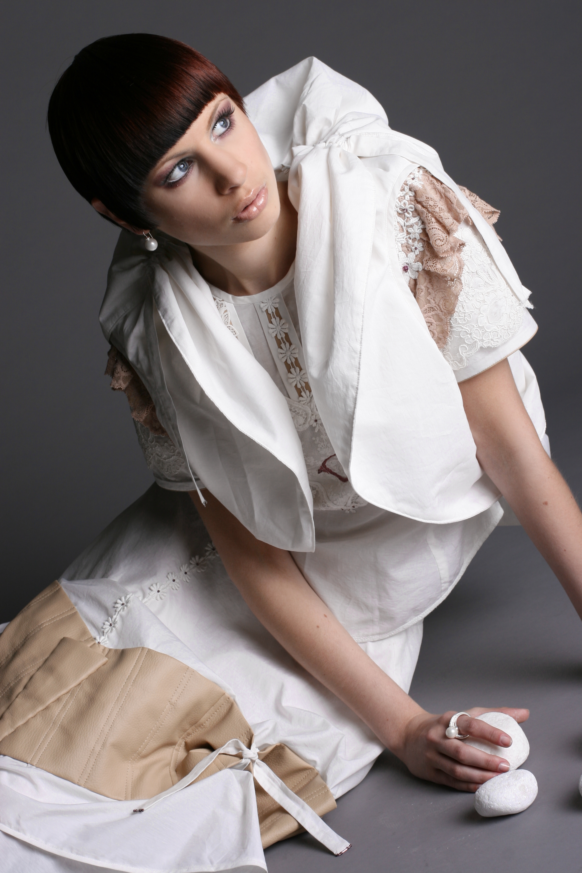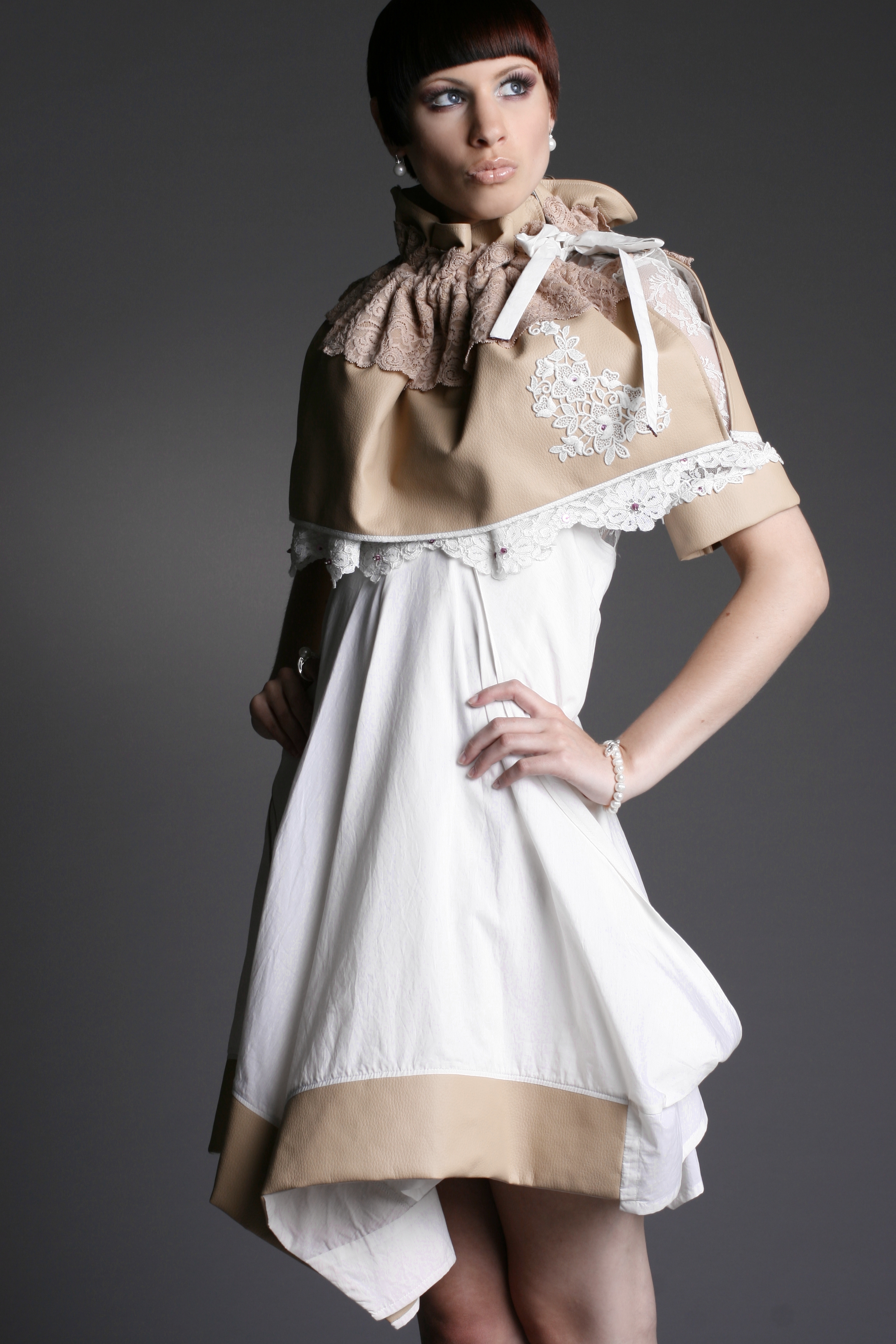 Der Kontrast von Frau und Mann, Stein und Vogel wird durch die Kombination von feinem Baumwollbatist, Spitze und Kunstleder erzielt.