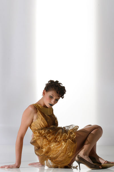 A golden sea of ruffles and flounces. A generously cut dress made of shimmering organza and lined with fine lace is unique and of Leonid Matthias..